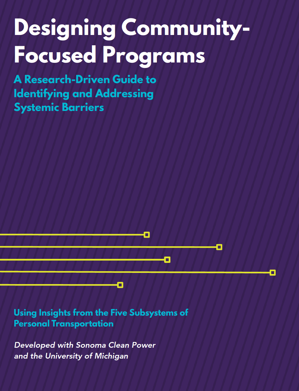 Designing Community-Focused Programs is a research-driven practice guide developed by Sonoma Clean Power and the University of Michigan. Grounded in research from the Five Subsystems of Personal Transportation, it offers practical tools to help utilities, public agencies, and community partners identify systemic barriers and design programs that better align with how people navigate complex systems and their lived experiences.
